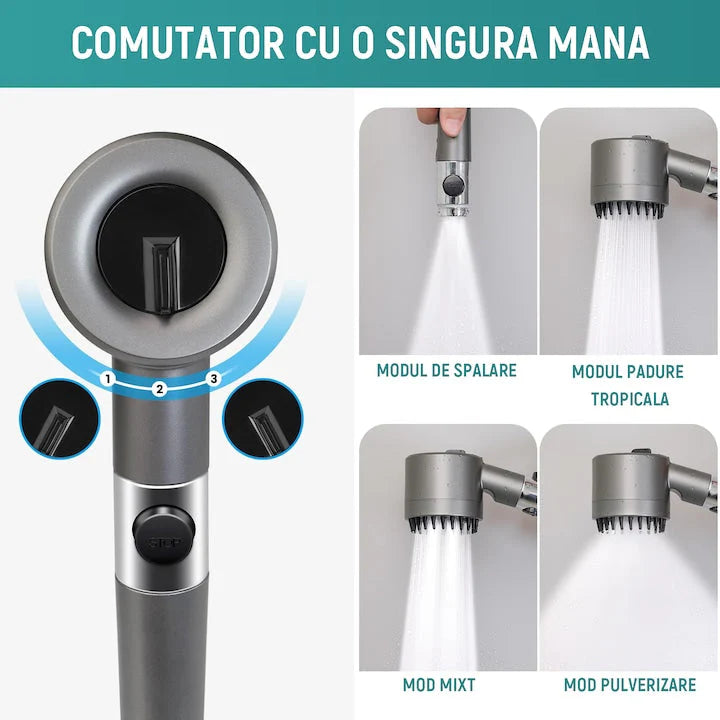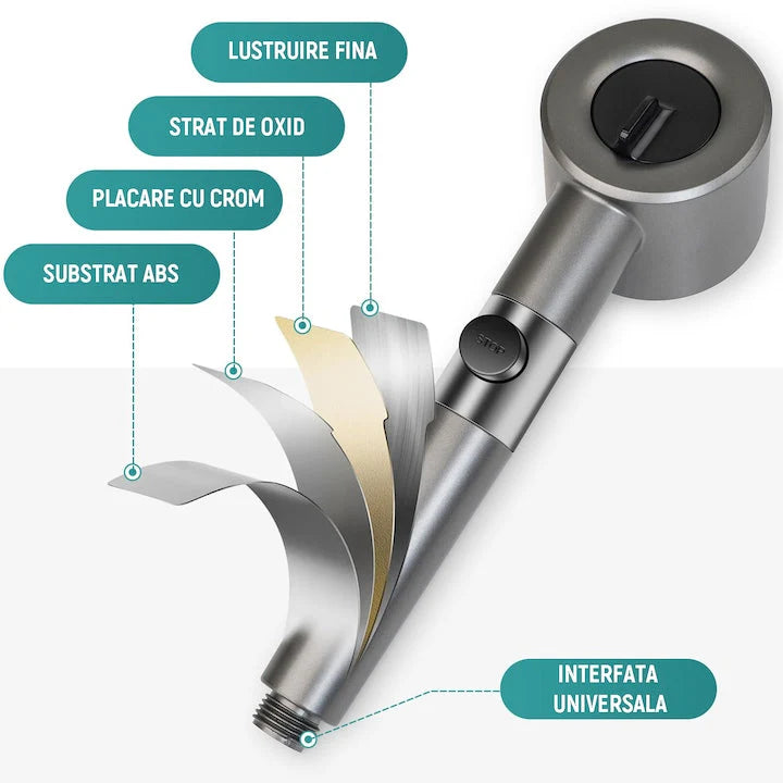 Filtrarea minerală dublă purifică apa, în timp ce designul presurizat oferă un debit constant și puternic — exact ce lipsea pentru o experiență de duș premium la tine acasă.